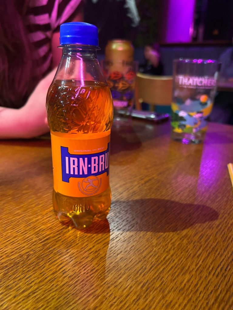 Here’s a tiny bottle of Irn Bru that my Non-Scottish trivia team received at the Scottish-themed pub quiz as a consolation prize for coming in dead last:
